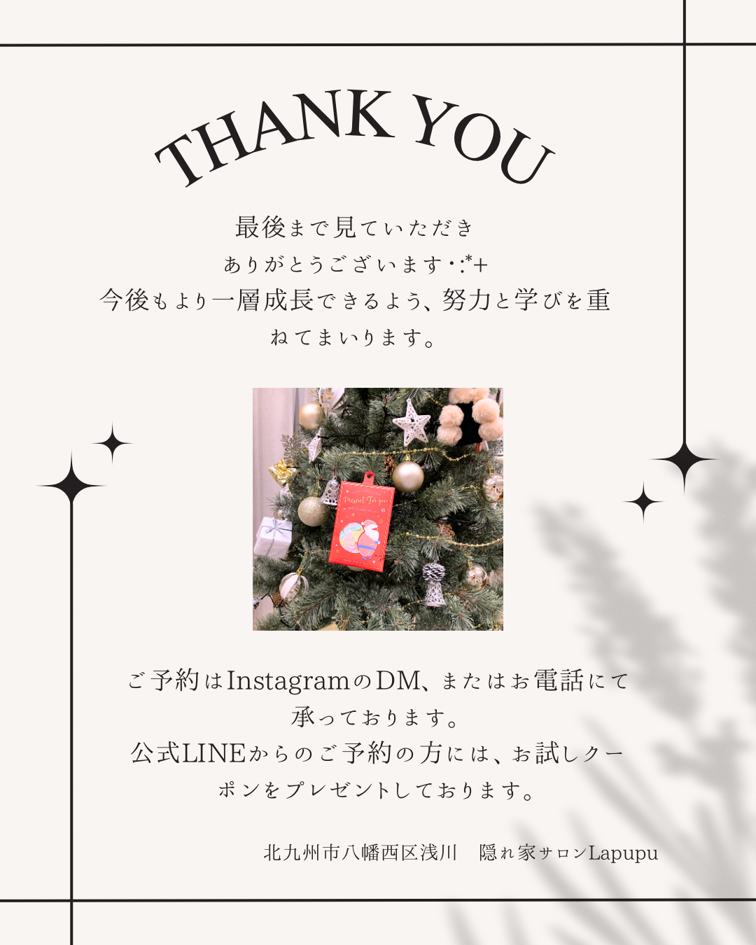 こんにちは✨北九州市八幡西区浅川 隠れ家サロンLapupu オーナーのこめか美ジュンです・:*+.先日は皆様素敵なクリスマスを過ごされましたか??🎄我が家は24日の夕方〜家族でクリスマスパーティをしま…